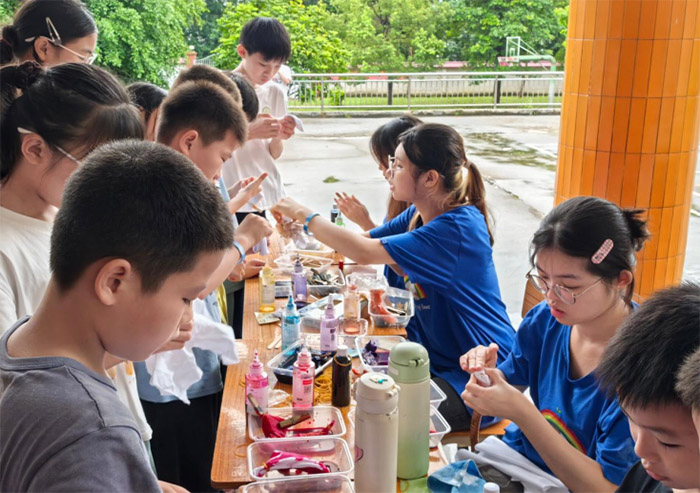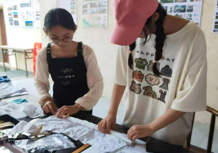 在鄉村振興和“百縣千鎮萬村高質量發展”工程視域下,以實現河源藍染傳統技藝的活態延續為目的,2025年4月至8月,指導教師廣東技術師范大學美術學院趙婷婷、鹿新杰,帶領全體大創團隊成員鐘嘉恩、民族學院龐佩容、數學與系統科學學院李淑銀、文學與傳媒學院詹佩蕓,和研究生黃春涌、王子怡一起展開《大美仙塘,炫彩扎染—做非遺文化的傳承者》項目,從河源仙塘南園古村的幻藍古染工坊,到廣東技術師范大學的學生活動中心,再到梅州五華縣歧嶺鎮華源小學的課堂,人們在實踐中了解藍染的奧秘和趣味,體驗客家傳統的質樸和智慧,實現“讓傳統技藝活在當下”。