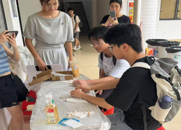 藍染進校傳古韻,青春執手續新篇 以藍染宣傳體驗活動的形式走進校園,我們在廣師大河源校區的學生活動中心擺出展臺,讓傳統技藝與青春氣息在夏日里撞出了溫暖的火花。看著同學們圍在展臺前好奇打量的身影,我們忽然明白:真正的文化傳承,從來都需要這樣鮮活的相遇。活動剛開始,藍染作品展示區就被人群圍起來。那些方巾上,夾染的幾何紋樣剛勁利落,捆染的云紋曲線溫柔流轉,深淺不一的靛藍色在陽光下泛著植物特有的光澤。負責講解的同學剛解說完藍染的染料來源與技藝分類,立刻就有一位穿黑上衣的女生指著展品方巾輕聲驚嘆“這中藍色居然是植物制作出來的”,手指在布面紋理上輕輕摩挲。當第一塊浸過染液的棉布被撈出,看著白坯布上漸漸暈開的藍霧,圍觀的同學們發出整齊的驚嘆聲,手機快門聲此起彼伏。活動接近尾聲時,留言板上已經貼滿了便簽,藏著同學們對河源藍染最真摯的期待。當傳統技藝走出古村、走進校園,當同學們的指尖觸碰到織物與染料,文化傳承就有了青春的模樣。這場短暫的藍染體驗,不僅讓同學們收獲了親手制作的禮物,更在心里種下了對河源藍染技藝的熱愛。