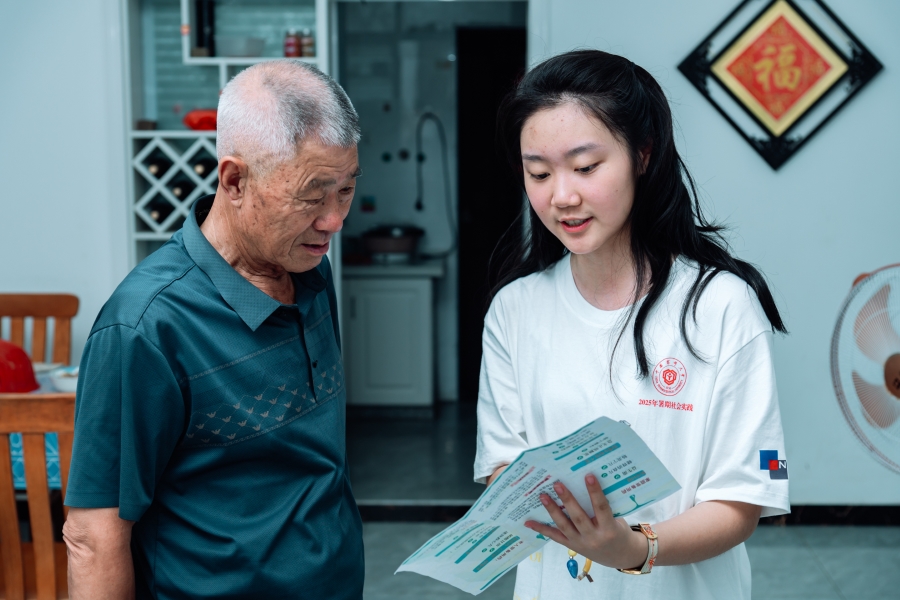 圖為實踐團成員向村民科普藥品安全及垃圾分類知識。劉銘宇 攝