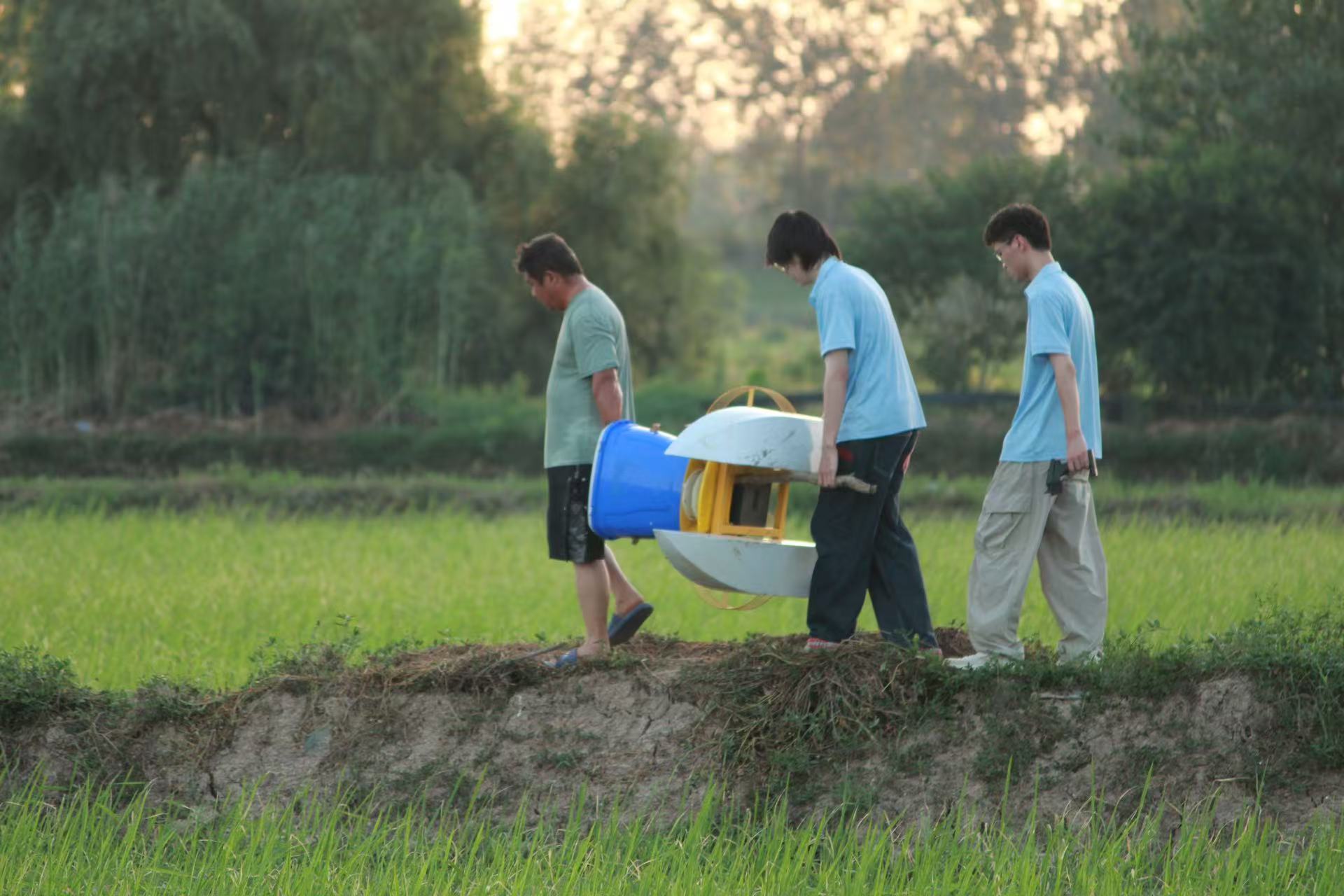 下午,稻田里傳來陣陣的電機聲,一臺身形小巧、配備攝像頭和傳感器的無人艇,靈活穿梭于田間溝渠與灌溉水域。實踐團正用它做下田試驗。