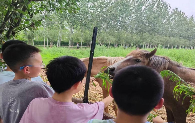 孩子們來到農(nóng)場的馬廄,親手喂養(yǎng)馬匹,并與這些溫順的動物互動。尤其是十歲的辰辰(化名),他在實(shí)踐團(tuán)成員的鼓勵(lì)下,第一次克服了與動物親密接觸的恐懼,最終與馬匹建立了信任關(guān)系。孩子們從最初的遠(yuǎn)遠(yuǎn)觀望,到后來主動為馬匹梳毛、喂水,這一過程不僅幫助他們學(xué)會了照顧和尊重生命,也培養(yǎng)了責(zé)任感和共情能力。
