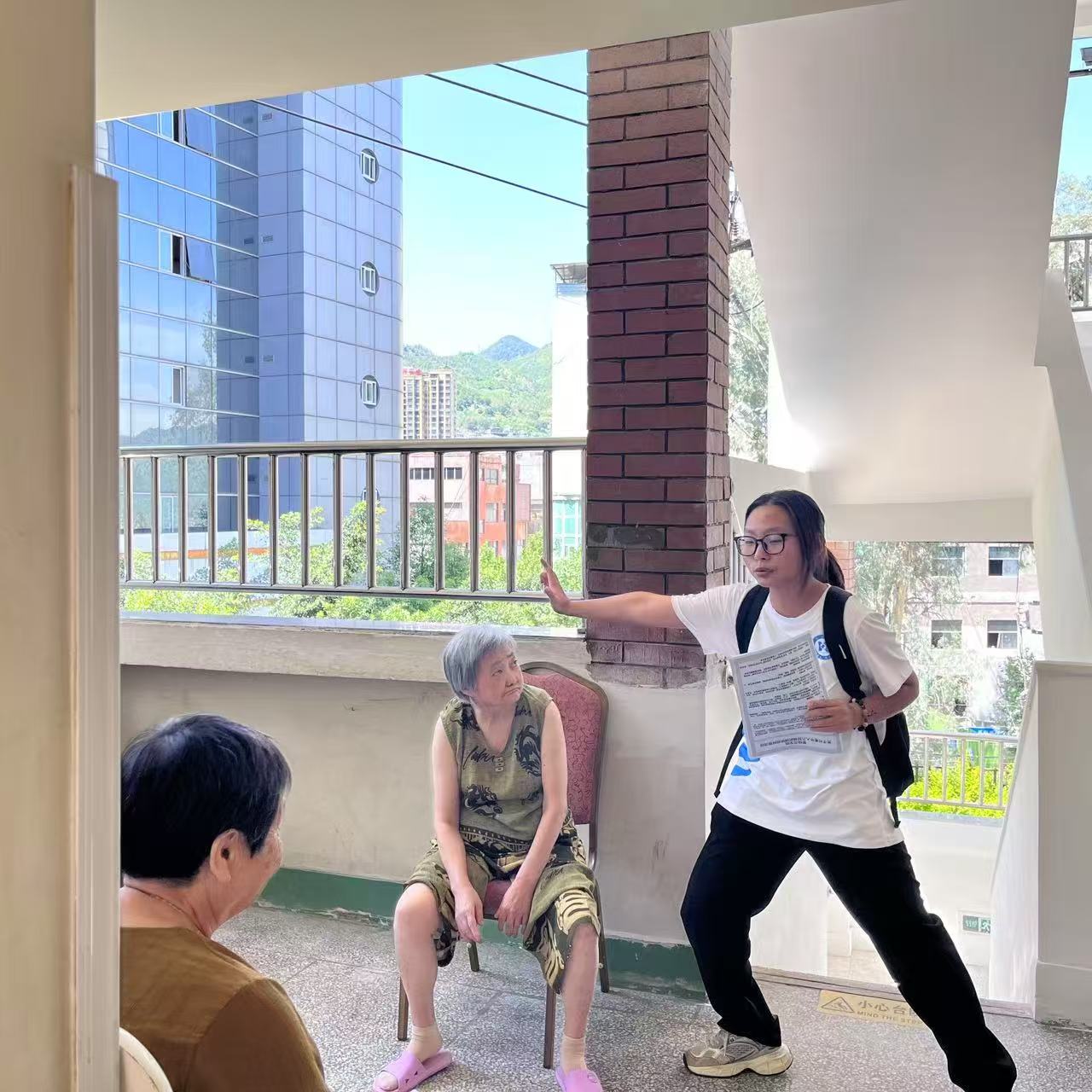 團隊將八段錦的八個經典動作分解為“慢動作教學-細節糾正-連貫練習”三階段,尤其注重“沉肩、墜肘、松腰、坐胯”等關鍵姿勢的指導,確保老人們既能掌握動作要領,又能避免運動損傷。面對高齡或行動不便的老人,團隊推廣“坐式八段錦”,通過簡化動作幅度、增強平衡支撐,讓傳統功法適配更多人群。一位養老院老人感嘆:“以前覺得八段錦難,沒想到坐著也能練,孩子們教得仔細,練完渾身舒坦!”