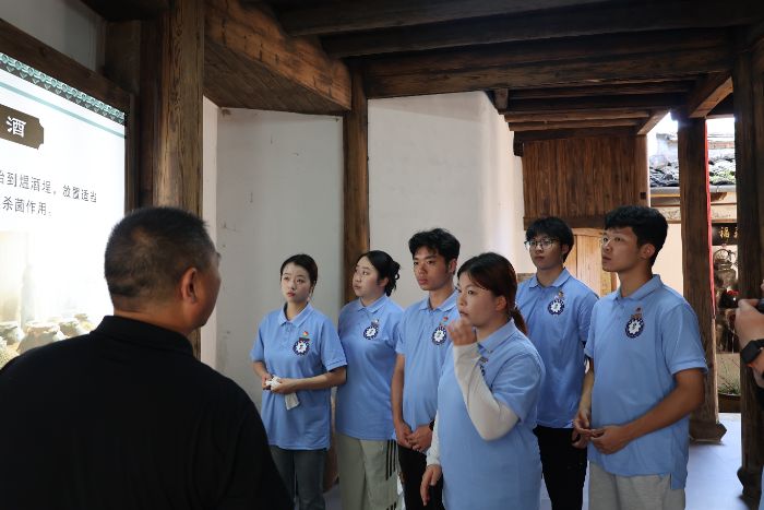在傳統黃酒釀造作坊,隊員們開啟了對傳統工藝的探索。此次北墘村社會實踐活動聯系人、黃酒釀造傳承人吳善寨向隊員們介紹黃酒釀造的悠久歷史和獨特工藝,從原料的精選,到浸泡、蒸煮、發酵,再到最后的壓榨、陳釀,每一個環節都蘊含著古人的智慧與匠心。隊員們認真聆聽,仔細觀察,不時提出心中的疑問。