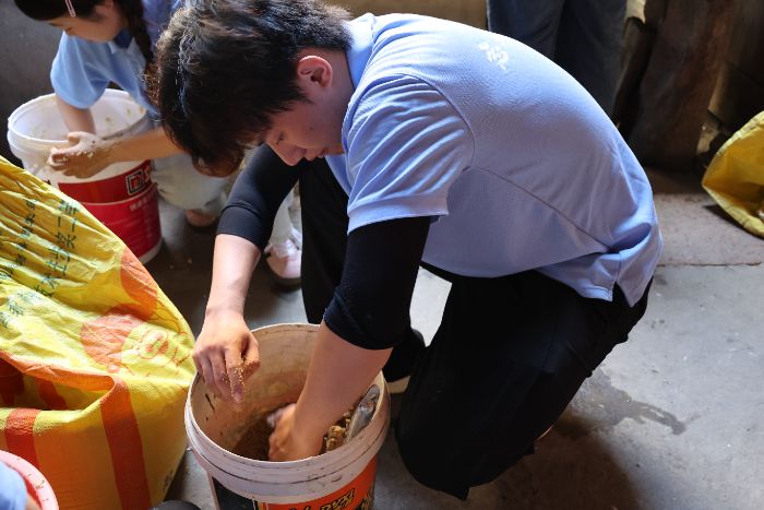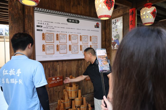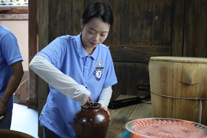 隊員們在吳善寨指導下進行糯米浸泡、蒸煮,觀察發酵過程中的變化。同時,通過線上直播方式,讓更多人了解傳統黃酒釀造工藝和黃酒文化,以新媒體助力非遺技藝傳播。
