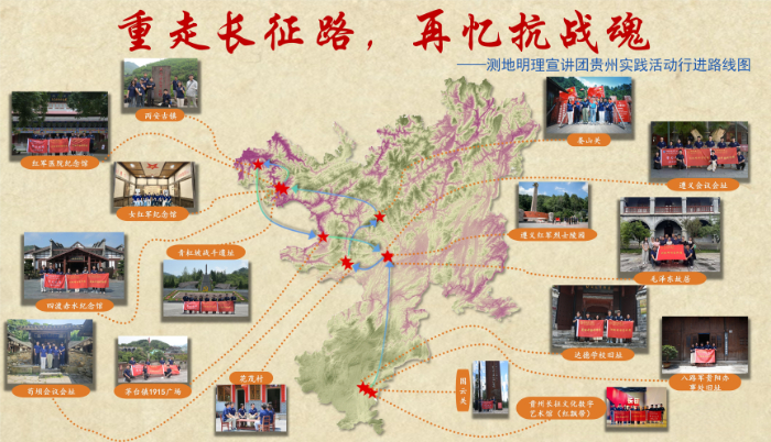實踐結束后,宣講團成員集合專業所學,初步繪制形成“貴州紅色教育資源圖譜”,整合標注貴陽與遵義兩地的紅色地標、紀念場館與歷史遺跡。宣講團嘗試將地理信息系統專業優勢融入實踐表達,設計制作《重走長征路,再憶抗戰魂——測地明理宣講團貴州實踐活動進行路線圖》,以專題制圖方式呈現路線行程與資源分布,助力實踐成果可視化、知識結構圖譜化。為后續開展課程思政教學、紅色旅游資源整合及宣講素材開發提供了直觀載體,也成為將專業所學服務紅色育人的一次有益探索。