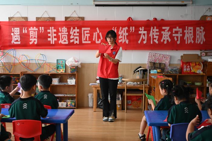圖9 幼兒園剪紙課堂 圖10 隊員教兒童剪紙