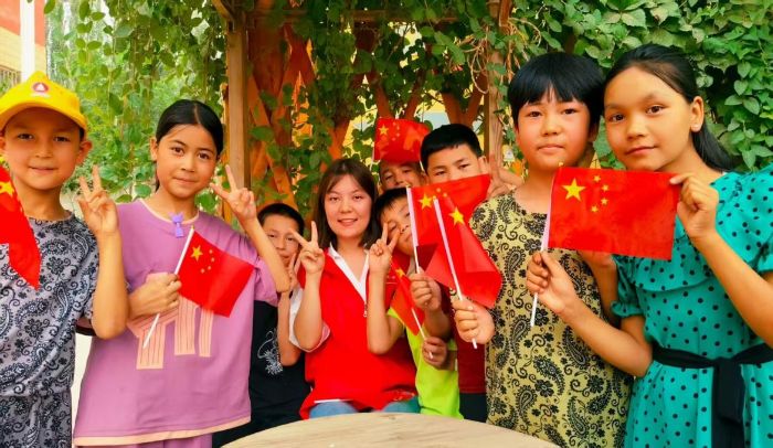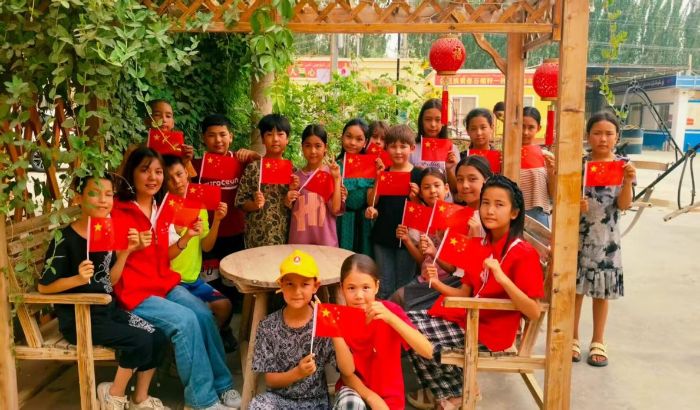 “童心向黨”故事會上,隊員們講述英雄模范事跡,帶領孩子們認識國旗國徽,厚植愛國情懷。課程尾聲,隊員與孩子們手持國旗合影,鮮艷的國旗在鄉村院落中飄揚,“愛國愛疆”的種子在童心扎根。