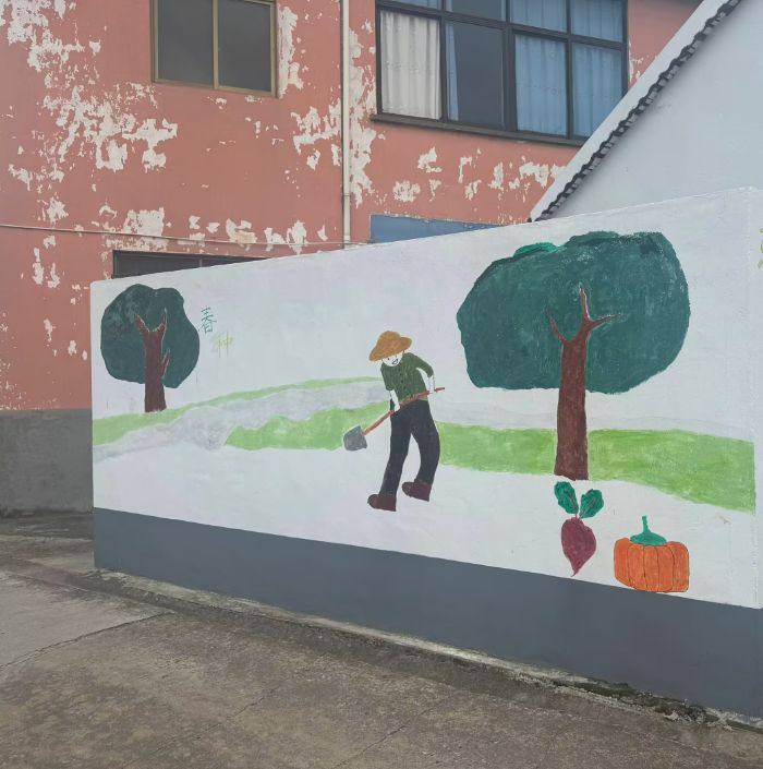 實(shí)踐團(tuán)抵達(dá)鄉(xiāng)村后,迅速與村里孩童打成一片。大家手持顏料畫筆,圍繞“春種”“秋收”主題,在鄉(xiāng)村閑置墻面上開啟創(chuàng)作。繪制“春種”畫面時(shí),孩子們仔細(xì)描摹農(nóng)夫耕地的姿態(tài),志愿者在旁啟發(fā):“就像播下種子要精心照料,垃圾分類投放,也是給環(huán)境‘耕地施肥’。”畫“秋收”場景,金黃麥浪、飽滿作物躍然墻上,志愿者順勢引導(dǎo):“收獲的不僅是糧食,做好分類,鄉(xiāng)村收獲的是整潔與美好。”一筆一畫間,環(huán)保與農(nóng)作的聯(lián)結(jié),悄然在孩子心中扎根。