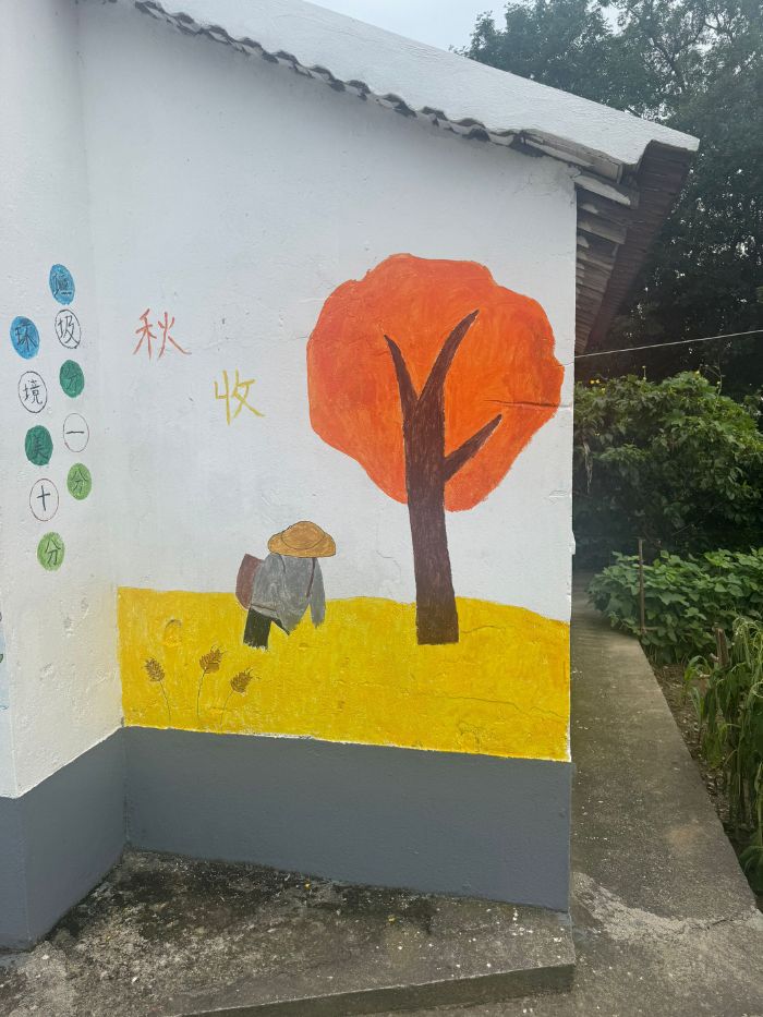 圖為志愿者與孩子們共同繪制的“秋收”主題墻繪。房軒 供圖