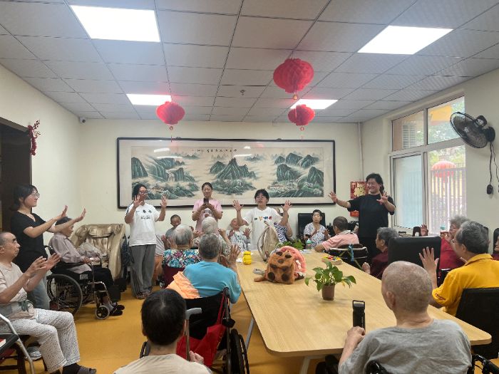 護理院活動室內,紅燈籠點綴,山水畫添韻,溫馨氛圍已就位。志愿隊的文藝表演正式拉開帷幕,青春旋律與溫暖故事在此交織。志愿者們組隊合唱經典紅歌,《我和我的祖國》的旋律響起,熟悉的曲調瞬間牽動老人的心。他們或輕聲跟唱,或打著節拍,眼神里滿是對歲月、對祖國的深情。