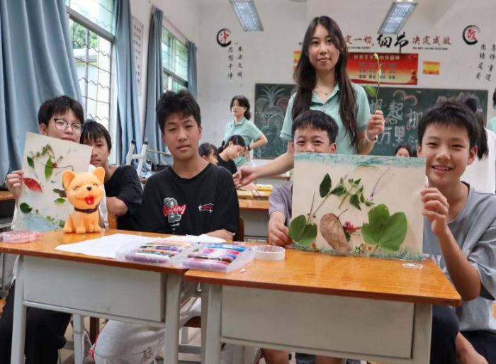 隨著課程的深入,師生情誼日益深厚。實踐隊員的真誠付出贏得了孩子們的信任,孩子們開始愿意向隊員們傾訴內(nèi)心的想法。尤為可喜的是,原本沉默寡言的澤西(化名)同學,也開始主動參與課堂互動,與初時的靦腆形成鮮明對比。隨著課程的深入和師生信任的建立,他開始嘗試參與互動,眼神中的躲閃逐漸減少。在一次草木貼畫創(chuàng)作展示課上,當澤西(化名)捧著自己精心制作的作品進行展示時,鏡頭恰好捕捉到了他發(fā)自內(nèi)心的燦爛笑容。