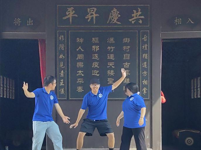 實踐團成員在館內興致勃勃地進行了儺戲動作初體驗。在學習“三蹬步”“開山式”“踩八卦”等基礎動作時,成員們跟隨教學視頻認真模仿,很快便體會到表演的不易——沉穩步伐帶來的腿部顫抖、遒勁揮臂引發的臂膀酸痛,以及精準方位轉換所需的控制力,短短幾分鐘的練習,就讓不少人額頭沁汗,深刻感受到儺戲演員對肢體力量與技巧的嚴苛要求。