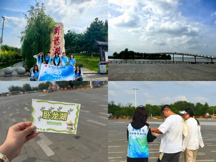 康平臥龍湖,水波瀲滟,蘆葦搖曳。海納康途三下鄉(xiāng)實踐團(tuán)隊帶著精心準(zhǔn)備的文旅宣傳周邊,在這里開啟了一場別樣的推廣行動。隊員們分成小組,沿著湖畔步道向游客分發(fā)周邊,介紹臥龍湖的生態(tài)特色與傳說故事:“您知道嗎?這里是遼寧省最大的平原淡水湖,每到遷徙季,上萬只候鳥會在此停歇呢!”聽到外地口音,便熱情介紹康平的特色美食與民俗活動。汗水浸濕衣衫,卻擋不住大家的熱情。