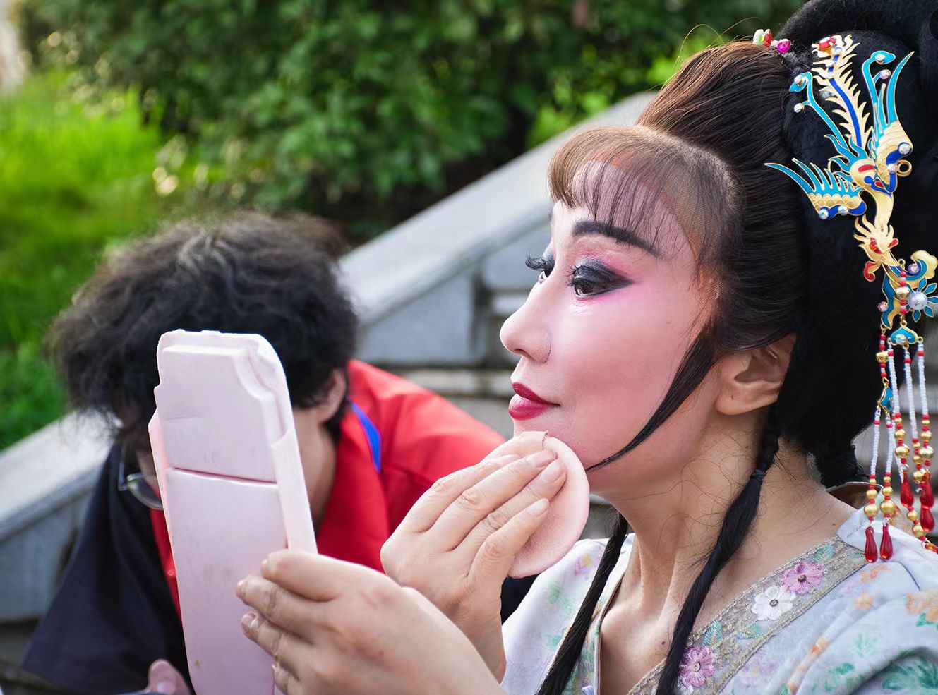 所謂的后臺(tái),竟只是一輛簡(jiǎn)陋的貨車車廂。夏夜悶熱,蚊蟲(chóng)成群 ,演員們就在這樣的環(huán)境中化妝。他們連坐的地方都沒(méi)有,看到隊(duì)員們前來(lái),還想把自帶的小板凳讓給大家坐。演員們所用的化妝品、服飾,都能看出明顯的使用痕跡,部分因經(jīng)費(fèi)有限而難以更新 。最艱苦的是“勒頭”的過(guò)程,用布帶緊緊勒住頭部以塑造臉型,常導(dǎo)致演員頭昏腦脹 。
