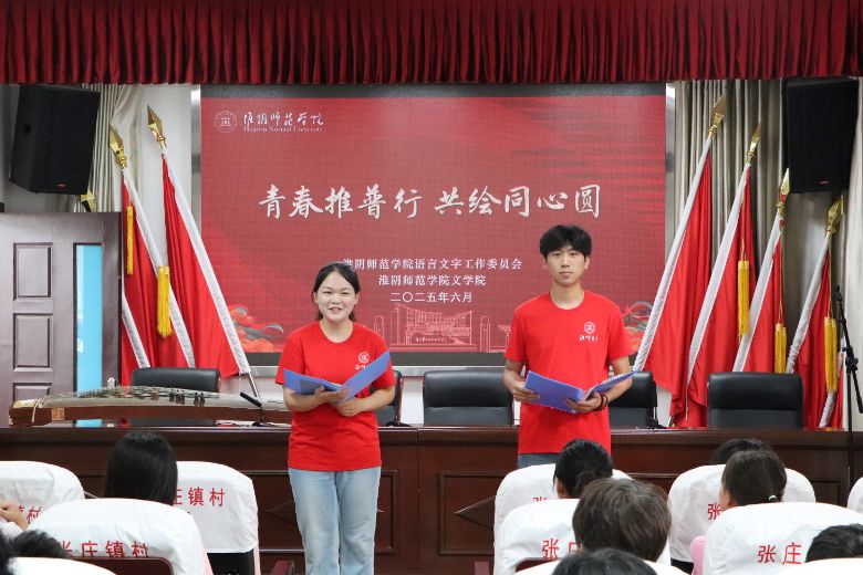 為深入貫徹落實黨的二十大關于“加大國家通用語言文字推廣力度”的決策部署,服務鑄牢中華民族共同體意識,6月27日,淮陰師范學院文學院大學生暑期社會實踐團聯合校語言文字工作委員會,走進淮安市馬頭鎮張莊鎮村,開展主題為“青春推普行共繪同心圓”的暑期“三下鄉”社會實踐活動。馬頭鎮紀委書記林寧,淮陰師范學院教務處副處長、語委辦主任皇甫素飛,文學院黨委副書記管婷婷出席活動。校教務處、文學院團學老師,文學院暑期社會實踐團的同學們和馬頭鎮部分小學生參加活動。
