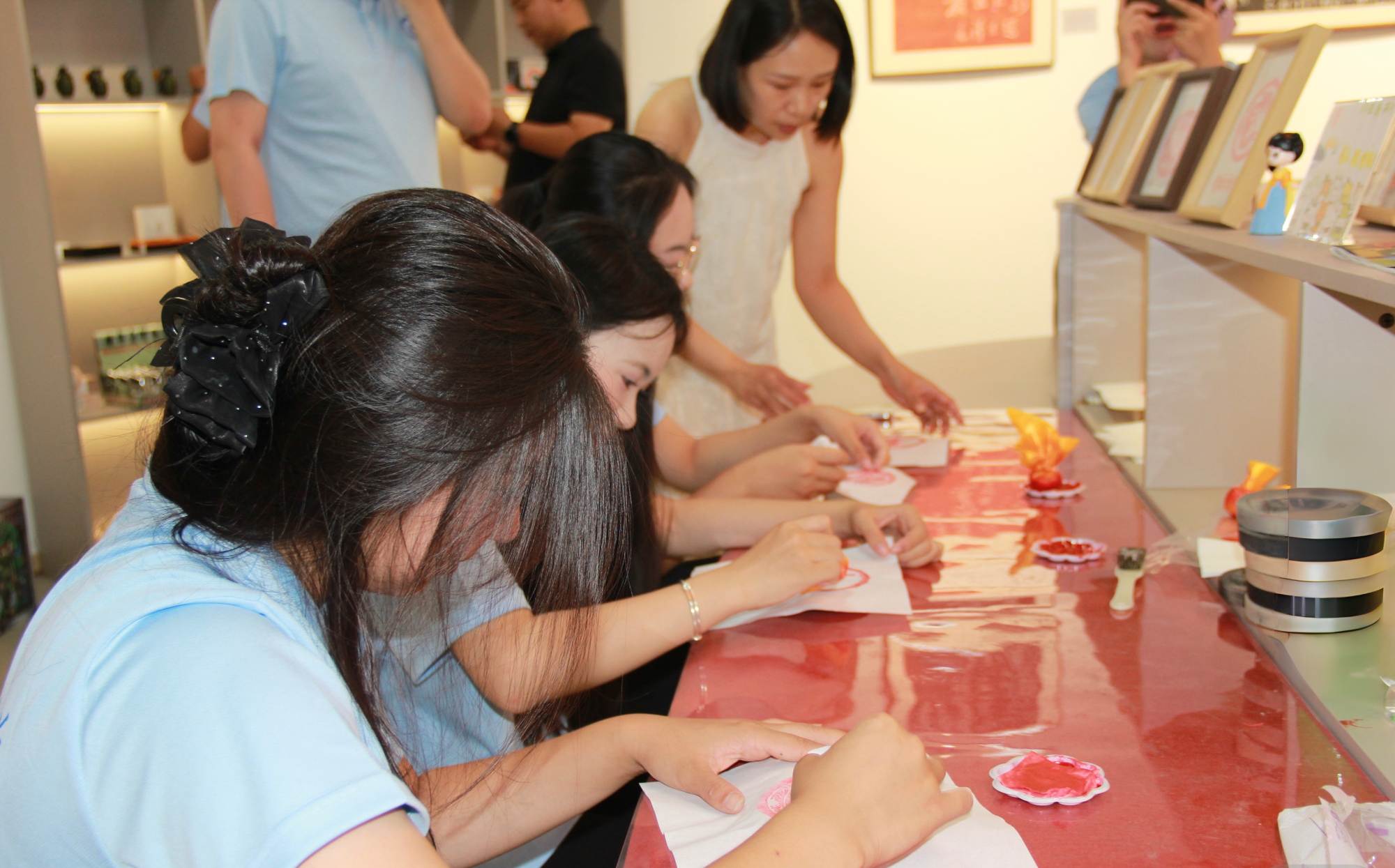 圖為靖宇英魂文創空間工作人員指導實踐團成員進行非遺拓印文創制作。楊濤 供圖