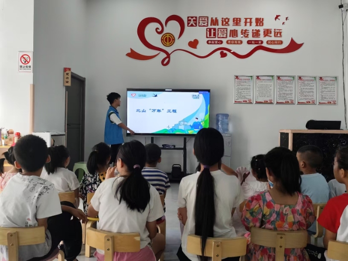 在講述北山“萬年”工程的過程中,志愿者以時間為脈絡,結合建設過程中的困苦環境和建設工人的高昂熱情,用建設過程中的圖片,以通俗易懂的方式向孩子們講述北山人的故事。同時播放北山“萬年”工程的宣傳視頻讓孩子們目睹北山“萬年”工程的巍峨和壯觀。孩子們眼神清澈,表情專注,深深地被巍峨壯觀的核廢料處理工廠震撼。青春的力量在幼小的心靈里勃發,埋下一顆為國奉獻的種子。