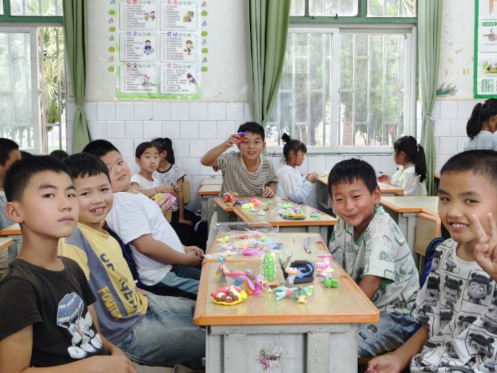 粘土手工課上,孩子們圍坐成一圈,小桌上擺著五顏六色的粘土,像鋪開了一片彩虹色的“魔法泥土”。志愿者剛演示完捏制小動物的基本步驟,小家伙們就迫不及待地拿起粘土,有的把紅色揉成圓滾滾的蘋果,有的用黃色捏出彎彎的香蕉,還有人試著將藍色和白色混在一起,說要做一朵“會下雨的云”。課堂里滿是細碎的“咔嚓”聲和孩子們的歡笑聲,粘土在小手里被捏、揉、搓、粘,慢慢變成小動物、水果、花朵,甚至還有帶著稚氣的“大恐龍”“小汽車”。志愿者們穿梭在孩子中間,手把手教他們捏出更精細的紋路,時不時被孩子們天馬行空的創意逗笑。最后,每個孩子都舉著自己的作品合影,粘土的溫度混著童真的熱情,成了鄉村午后最暖的風景。