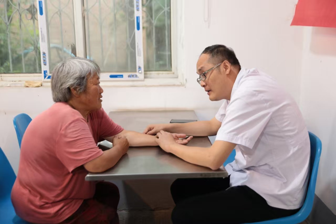 圖為中醫學院副教授譚輝為敬老院村民把脈