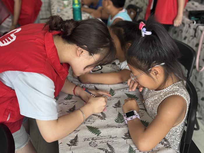 (團(tuán)隊(duì)志愿者和孩子一起書(shū)寫心愿便簽 黨欣悅攝)
