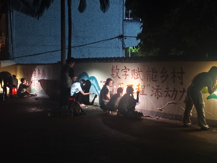為追回被天氣耽誤的進度,夜晚的村莊里,手電與手機閃光燈的光束照亮墻面,隊員們加班加點繼續創作。被汗水浸透的隊服、沾滿顏料的雙手、夜晚亮起的燈光,共同見證著他們的堅守,成為青春最鮮明的印記。