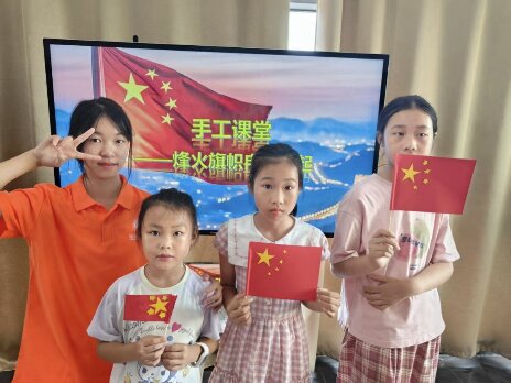 。為了讓小朋友們更好地理解愛國精神,志愿者組織小朋友們開展烽火旗制作的實踐活動。“統”心護苗隊隊員帶領各位小朋友繪畫拼貼烽火旗幟,將藝術創作與愛國主義教育相結合,和小朋友們一起重溫歷史、表達愛國情懷。以藝術的形式來致敬歷史,在動手實踐中感悟抗戰精神。