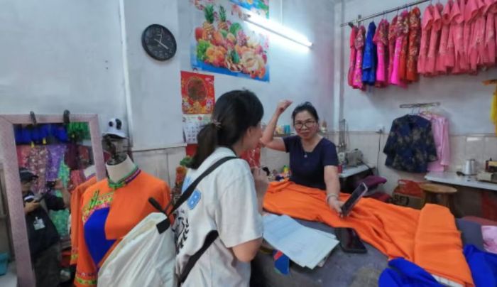 (圖為“學佬衫”手藝人為隊員介紹婚俗傳統 李智鈺 攝)