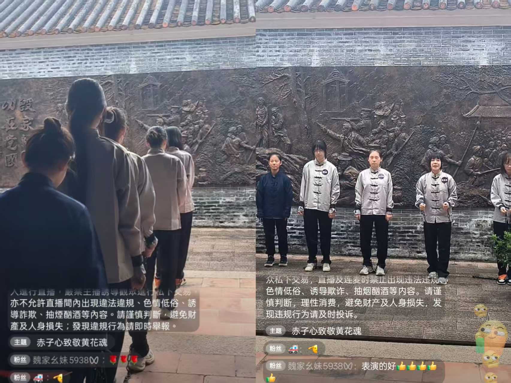 宣講中,Young實踐團同學結合實地場景,將黃花崗起義中三華村英烈舍身取義的故事娓娓道來。同時,為讓線上線下的觀眾在直觀形象的氛圍中受到感染和熏陶,Young實踐團在祠堂內進行了情景劇演繹,將三華村人徐維揚組織“選鋒隊”隊員在集之徐公祠前發動起義、中國近代民主革命家黃興先生秘密商討起義、革命烈士慷慨赴死等三幕情景進行了歷史再現。據線上觀眾反饋,“看點滿滿”。“你們演得很好嘛,尤其是第二幕,你們把黃興先生在集之徐公祠后閣樓秘密商討起義時那種小心、謹慎都演出來了,我在直播間看得都有些緊張。”三華村村民徐新晃直播結束后向Young實踐團豎起了大拇指。
