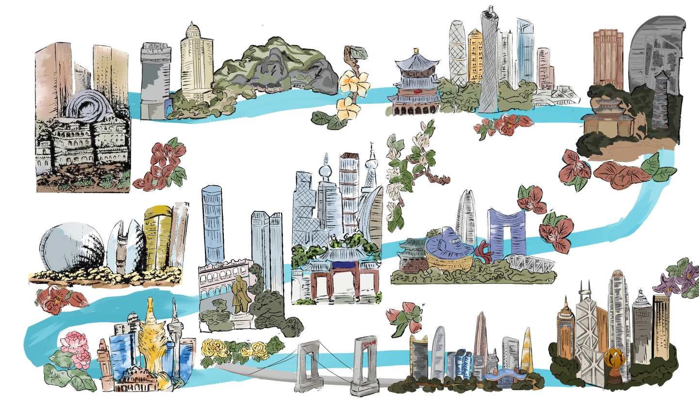 整幅墻繪用灰塑工藝的肌理以廣東西江的流向串聯起各大城市(從發源地肇慶出發,流經江門、珠海,連通澳門,途經廣州、東莞、深圳、惠州后,水流分支入中山,匯入佛山,最終通過珠江河口與香港相連,從而勾勒出獨特的城市脈絡),讓11個城市地標打破時空界限,一氣呵成,又用代表性花卉點綴每個城市,彰顯各自特色。鄭喻元同學稱,此設計受到國家級非遺灰塑代表性傳承人邵成村老師的啟發,“邵成村老師在接受Young實踐團采訪時提及嶺南灰塑與現代建筑的結合難題,而三華古村要開發商業街區,也存在過渡和銜接的困境。我們設計的這組墻繪讓嶺南灰塑與現代建筑穿越古今,完美融合,既是對技術難題攻克的期許,也是對傳統工藝的創造性表達。”