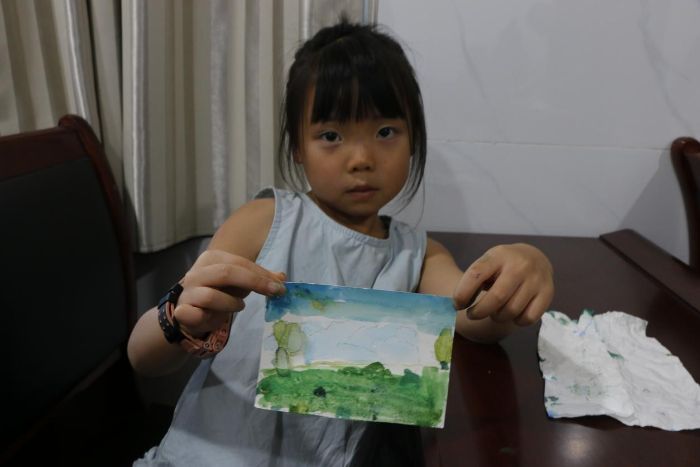 小朋友在展示自己的畫作攝|劉夢(mèng)鈴