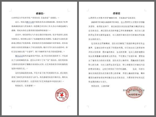 此次實(shí)踐的成果與溫度也吸引了社會(huì)各界的目光:山西共青團(tuán)、山西青年報(bào)等主流媒體紛紛以“墻繪添彩美化鄉(xiāng)村”“美院青年把論文寫在大地上”為題進(jìn)行報(bào)道,用鏡頭和文字記錄下美院學(xué)子在鄉(xiāng)村振興、非遺傳承與基層美育中的青春答卷,讓這場31天的夏日奔赴被更多人看見、記住并點(diǎn)贊并收獲多封感謝信。