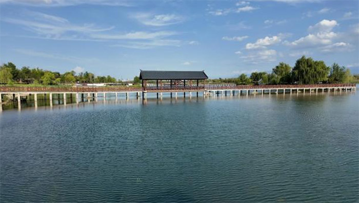 二、品鑒“水景觀”:昆明池重現(xiàn)的漢風(fēng)雄韻 實踐團走進昆明池景區(qū)。這座開鑿于漢武帝時期、曾是我國古代最大的人工湖泊,經(jīng)當(dāng)代重建煥發(fā)新生。成員穿梭水域島嶼間,以鏡頭捕捉 “鵲橋仙影”“漢堤攬勝” 等漢文化景觀與現(xiàn)代水景的交融畫卷。碧波映亭臺,歷史厚重感與時代活力在此碰撞。通過與游客、管理者的交流,團隊深入了解了昆明池作為大型水景觀在規(guī)劃理念、生態(tài)維護、公眾體驗方面的成效與挑戰(zhàn),并就可持續(xù)水生態(tài)景觀建設(shè)理念進行了廣泛宣傳。