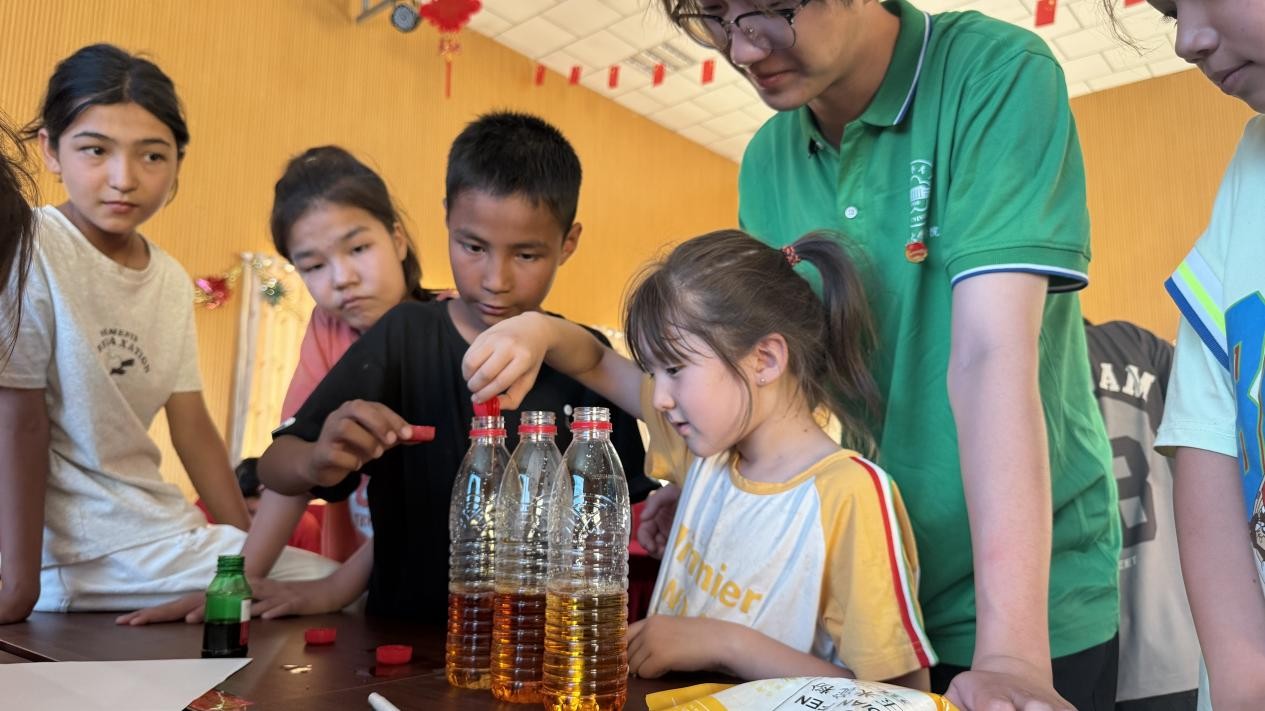7月10日,石榴花開實踐團隊在托喀依鄉亞蘇克村帶領當地小朋友們探索昆蟲世界的奧秘,體驗趣味化學實驗的魅力。