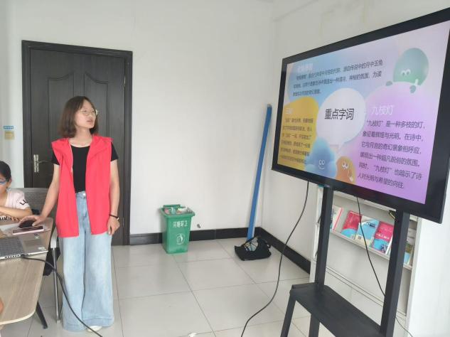 在字詞學習環節,團隊準備了“斜”“軋”“蟾”“泓”等字詞,還有“老兔寒蟾”“九枝燈”“玉輪”等重點字詞及意象講解。成員朱文文在講解《夢天》時更將課堂氛圍推向了高潮。她通過生動形象的比喻和描述,將這首詩中的難點、重點化抽象為形象,灌輸給小朋友們。