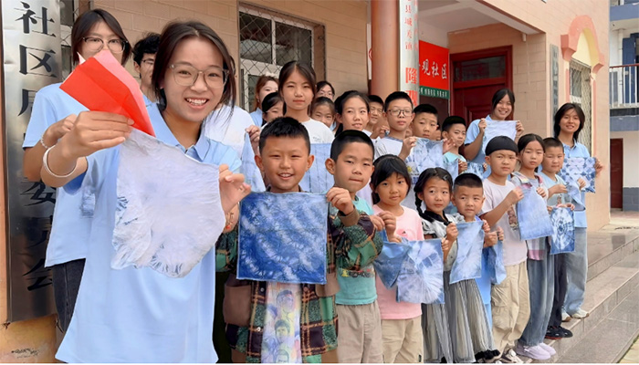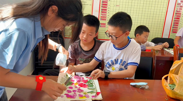 在美育與勞動教育方面,團隊開設了形式多樣的藝術與手工課程。在“手工扭扭棒課”與“紙漿畫課程”中,孩子們利用簡單的材料,創作出充滿想象力的作品。團隊還將非物質文化遺產帶入課堂,“非遺扎染課”讓孩子們在動手實踐中領略了傳統工藝的魅力。在“植物拓染課”上,孩子們利用花草的天然色彩與形態,在布料上進行創作,體驗發現自然之美的樂趣。此外,“活力跳操課”和“音樂課”則讓孩子們在律動和歌聲中釋放天性。