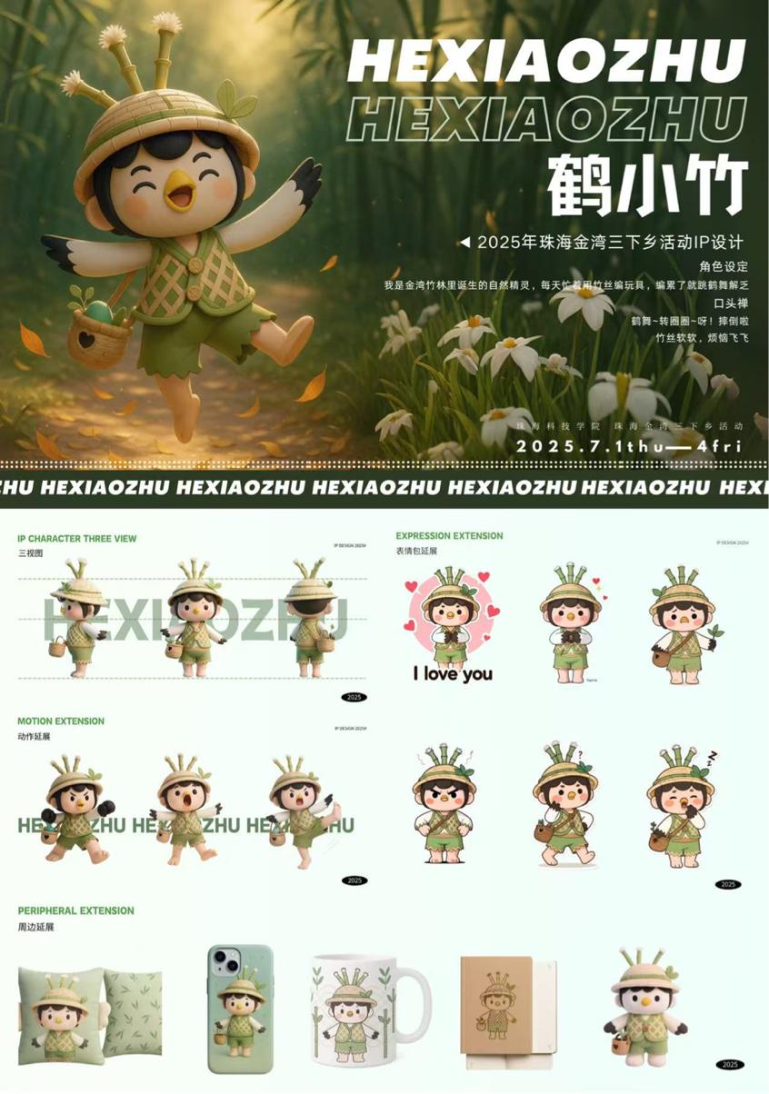 為助力海澄村文化傳播,我們結合當地特色,設計了以三灶鶴舞為基礎、融入竹編元素的卡通IP形象“鶴小竹”,旨在通過創新形式推廣當地文化,為非遺傳承注入年輕活力。