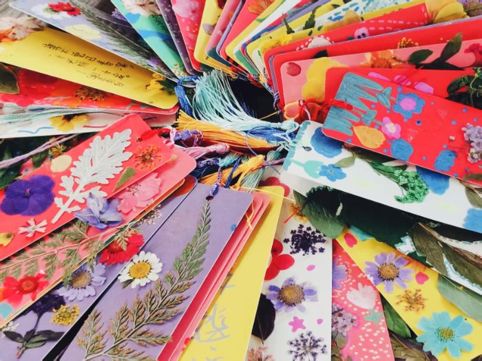 在創意書簽制作環節,孩子們在隊員們的帶領下走進校園周邊,采摘野花,為書簽制作準備自然素材。回到教室后,孩子們充分發揮想象力,用干花、彩筆、固體膠等材料制作獨具特色的書簽。