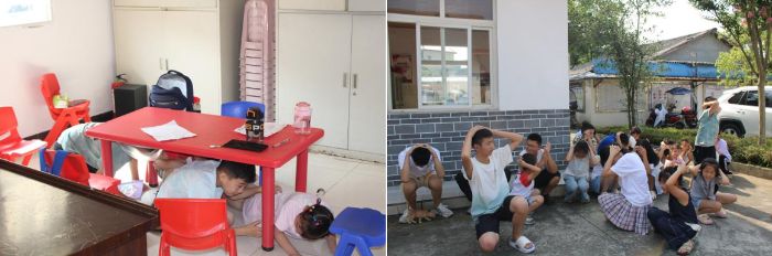 理論講解結束后,地震演練隨即展開。為保障演練效果,團隊提前布置場地、設置模擬場景。地震預警鈴聲響起,孩子們在隊員指揮下,迅速按所學知識行動:躲至桌下、書包護頭、身體蜷縮。警報終止后,大家雙手護頭,沿預定路線快速有序撤離至室外安全區域。