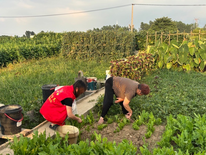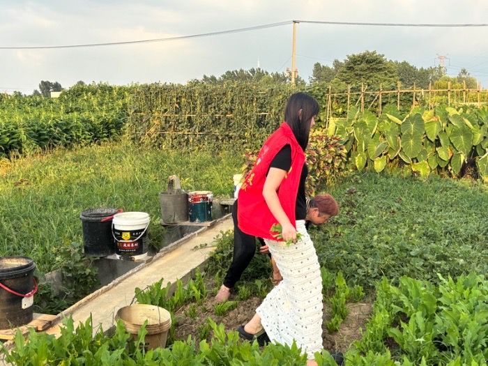 “基”情四射服務隊周佳芮供圖(成員周佳芮在田地里除雜草,觀察農作物的生長情況)