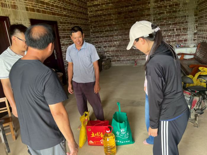 村委會負責人在前頭引路,手里拎著物資的實踐團成員們緊隨其后,沿著村里的小路陸陸續續往各家走去。陽光透過樹葉灑在地上,映出一行人忙碌的身影,手里的物資被小心護著怕磕碰。腳步聲、說話聲混著幾聲犬吠,在安靜的村子里漾開,像是一串帶著暖意的音符,往家家戶戶的方向慢慢鋪展。當村名接過慰問物資時,他們臉上綻放出感動的笑容,緊緊握著隊員們的手連聲道謝:“真是太謝謝你們了,總想著我們,心里暖烘烘的!”質樸話語讓隊員們深刻領悟:鄉村振興不是抽象概念,而是土地賦予的謙卑與責任。慰問對話中,鄉村的質樸與溫情悄然浸潤青年心田。