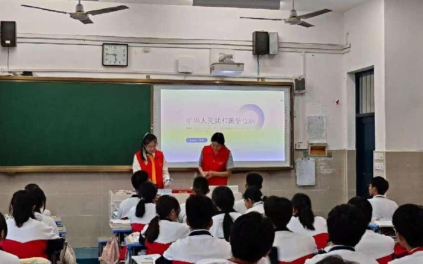 圖7太湖中學(xué)普法現(xiàn)場,隊員通過互動問答向?qū)W生解析《學(xué)位法》。(洪文杰 供圖)