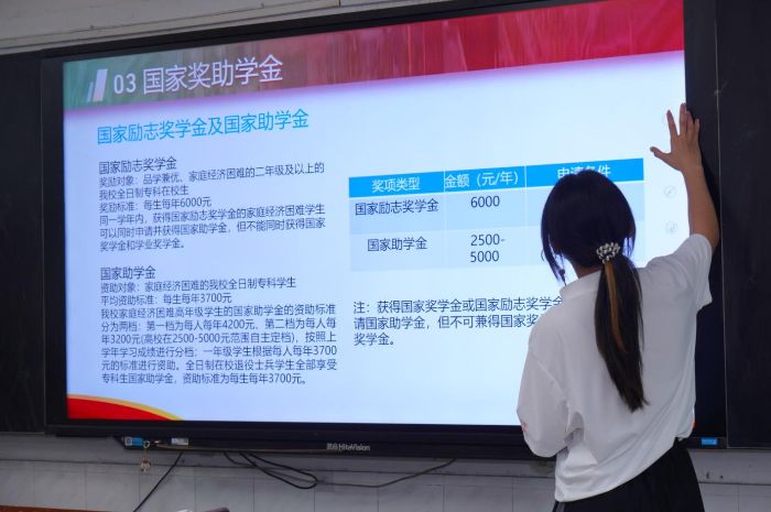 "等你們上了高中,成績(jī)優(yōu)秀又家庭困難,可以申請(qǐng)國家助學(xué)金;考上大學(xué)后,還可以申請(qǐng)助學(xué)貸款,工作后再慢慢還。"隨著幻燈片一頁頁得播放,孩子們的驚嘆聲此起彼伏。