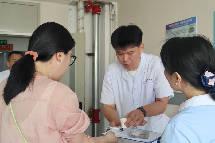 在肺功能檢查室,經驗豐富的金護士長詳細講解了兒童肺功能檢查的設備原理與操作流程。從如何指導孩子配合吹氣,到如何解讀檢測數據,再到不同年齡段兒童的指標差異,金護士長將多年的臨床經驗傾囊相授。她還為“準護士們”詳細講解了兒科門診的日常工作流程,并分享了兒童疾病的季節性規律:“春秋季呼吸道疾病高發,夏季則要特別警惕腸道傳染病。”金護士長特別叮囑道:“面對小患者,三分靠技術,七分靠溝通,要學會用孩子能理解的語言解釋治療過程,用家長能接受的方式傳遞關懷與溫暖。”同學們邊聽邊認真記錄,在提問互動與深入交流中,不僅收獲了寶貴的專業知識,更真切地感受到了護理前輩們以患者為中心的從業初心和精益求精的職業精神。
