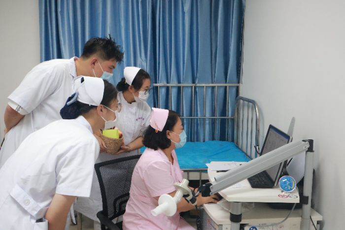 如果說兒科門診讓同學們感受到了護理工作的溫度,那么在健康管理中心的實踐則讓大家觸摸到了護理工作的廣度。在楊夙護士長的帶教下,同學們在實踐中深化了對健康管理的理解。在各個檢查室,同學們從最初的“手足無措”到后來的“熟練操作”,這一過程充滿了挑戰與成長。護士前輩們不僅詳細講解了各項儀器設備的檢測原理與操作規范,更結合自身經歷與同學們聊起護理學專業的發展前景:“你們要趁年輕多學技能,未來才能適應多元化的崗位需求。”這些諄諄教誨讓同學們深受觸動,大家對未來的職業道路都有了更加清晰的認識和規劃。