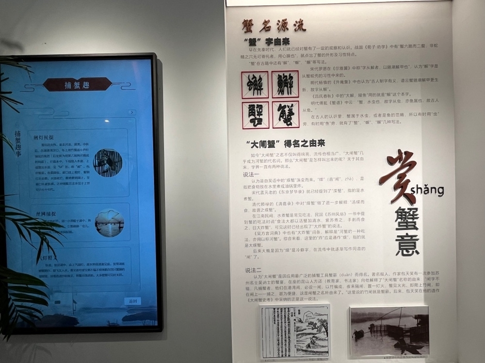 隨后,團隊成員分別去往村大閘蟹文化館及消涇村的陽澄湖地區(qū)抗日斗爭史跡陳列館。消涇村的大閘蟹文化館以“蟹”為主題,通過沉浸式光影體驗和多媒體互動生動地向游客們展示了這里的蟹文化,從“蟹”字由來,到蟹的生長周期、蟹的品種、蟹的做法等等,應(yīng)有盡有。“蟹”,早已不僅僅是消涇村村民們賴以生存的活計,而成為一代代傳承至今的文化基因。在這里,吃蟹和懂蟹已然密不可分,來往的游客們帶走的是肥美鮮嫩的陽澄湖大閘蟹,更是一身濃濃“蟹味”。
