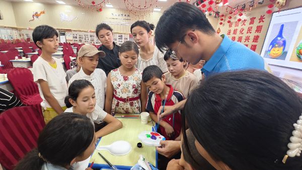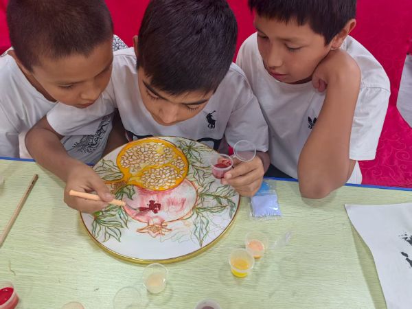掐絲琺瑯課堂上,團(tuán)隊志愿者溯源紫禁城的流光歲月,將景泰藍(lán)的百年榮光娓娓道來,為當(dāng)?shù)匦∨笥蜒菔?ldquo;掐絲彎作游龍紋,點藍(lán)暈染青鸞羽,淋膠凝駐流光影”的核心工藝,孩子們的眼眸被絢爛釉彩點亮,在團(tuán)隊志愿者的指導(dǎo)下,感受到了掐絲琺瑯的藝術(shù)魅力。