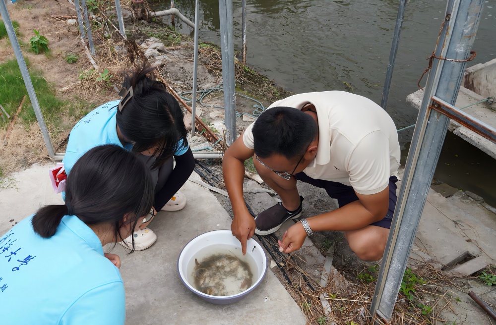 圖為團隊成員在標苗區觀察蝦苗生長狀況。吳曉牧供圖