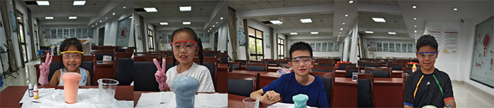 3.“大象牙膏”實驗 上午9:00,化學科普隊的2名成員在社區科學活動室搭建起彩色展板,用卡通大象圖案裝飾實驗臺。隊員們簡單介紹后開始分發的材料。