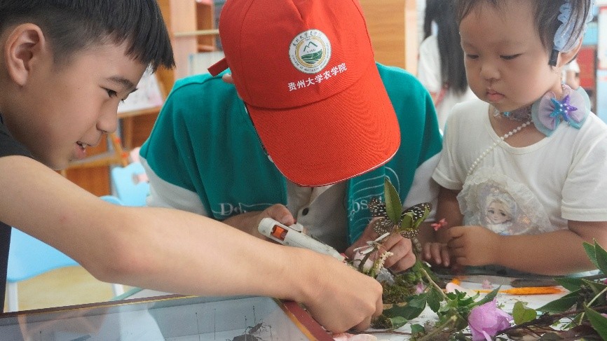 標(biāo)本制作臺(tái)上,隊(duì)員指導(dǎo)兒童輕展蝶翼,制作蝴蝶展翅標(biāo)本與昆蟲(chóng)微景觀。操作間隙,隊(duì)員們細(xì)心傾聽(tīng)留守兒童心聲,記錄于心理健康檔案。當(dāng)絢麗的玉帶鳳蝶定格于標(biāo)本框,孩子們將親手制作的蝴蝶相框與生態(tài)微景觀珍藏。三十一份標(biāo)本,成為大灣村珍貴的科學(xué)啟蒙見(jiàn)證。