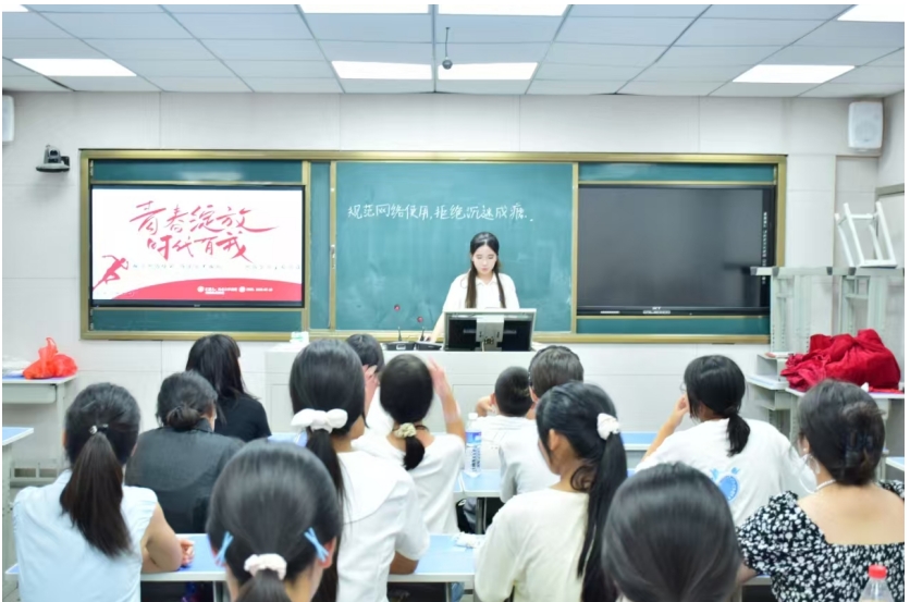 面對“雙減”政策對學科輔導的限制,實踐隊與校方座談后調整策略,將重心轉向價值觀引導和心理關懷。7月15日,一場以“規范使用網絡,拒絕沉迷成癮”為主題的互動式團課在樊村中學錄播室展開。